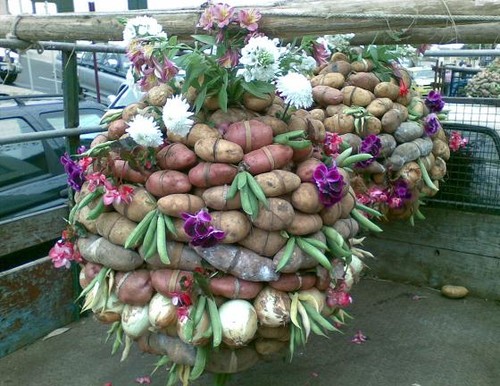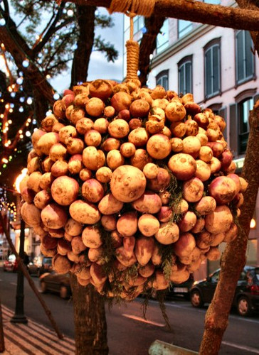 A tradicional e belíssima «charola» madeirense apresenta, por vezes, uma armação com a forma de esfera ou de pinha, feita de varas verdes amarradas entre si. De vários tamanhos, contém no bojo palha e na base uma grande abóbora a dar pelo nome de «tenerifa» (espécie introduzida na ilha vinda de Tenerife)), de modo a equilibrar a carga, constituída, como se disse, por frutos e legumes habilmente dispostos a cobrirem a armação, numa artística profusão de elementos, de perfumes e de cores.