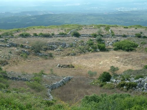 A seus pés, vertentes, socalcos, montes e encostas vestidos de tojo, de flores silvestres, de pedras cinzentas e milenárias. Depois, como um tapete, desde a base da serra e ao redor das aldeias, o vale fértil, a terra lavrada, amanhada, de semeio (batata, tremoço, aveia, cevada, trigo), tratada pelas mãos das gentes que olham cá de baixo o alto da serra e pedem à Senhora que as colheitas sejam fartas, que a chuva venha a tempo, ou cesse, quando desnecessária.